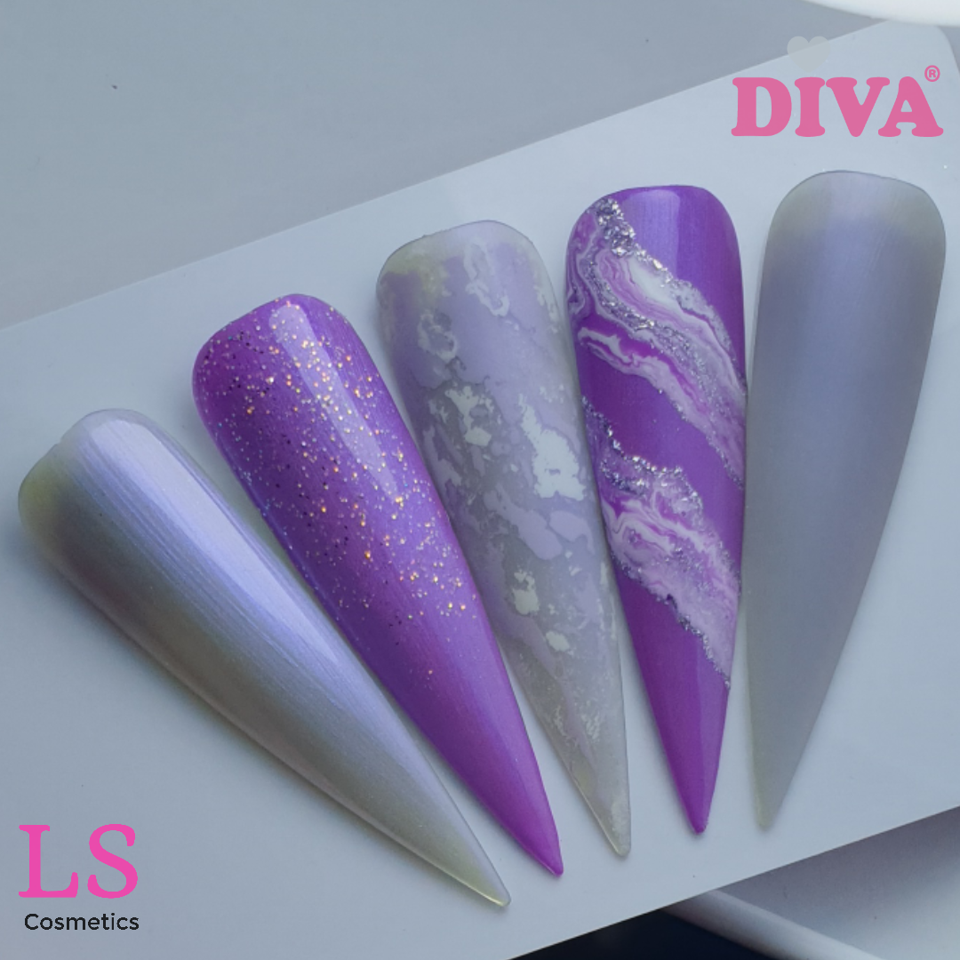 Diva Gellak Breathtaking, Fresh Violet, Pure White, Glitter Purple, DL Tarte Tartin, Foilbox 58