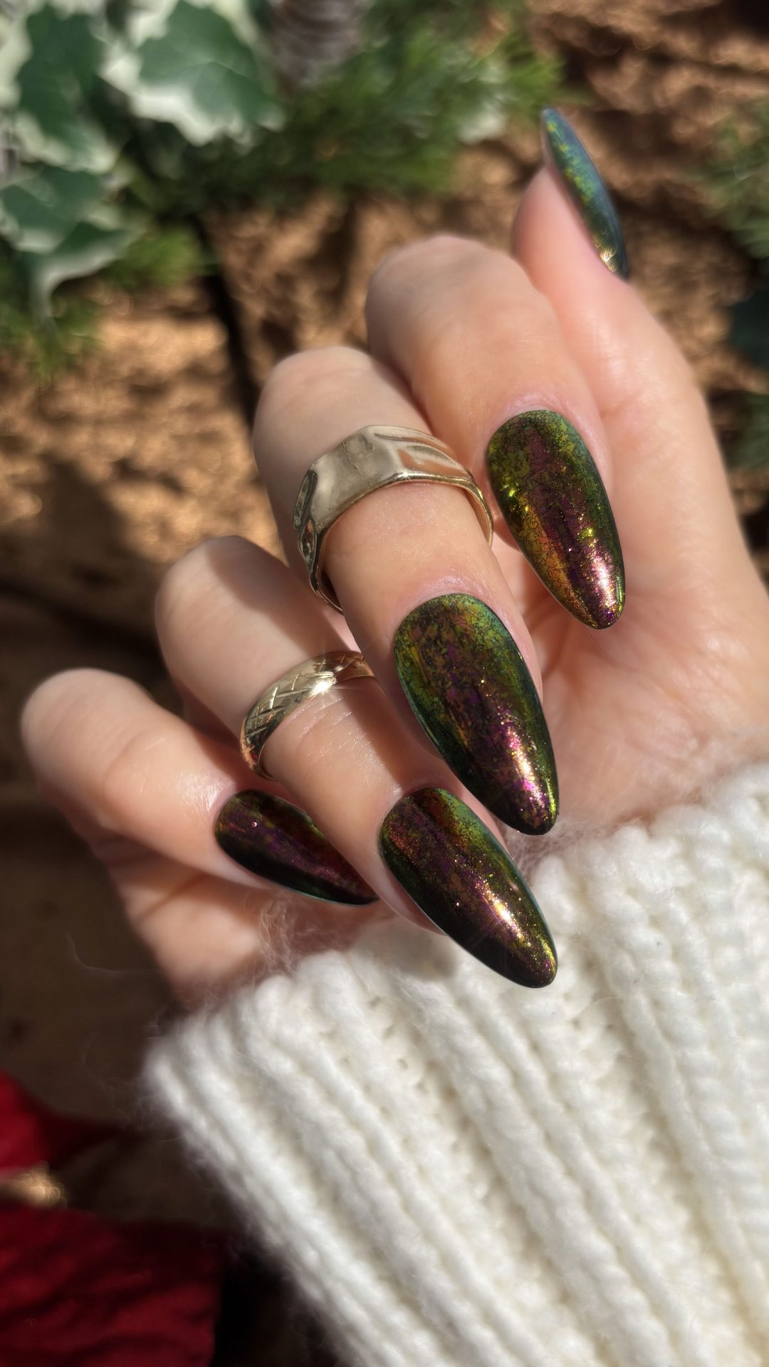 – dunne platte brons in pink chameleon glitters met amber, gold, fuchsia en beetje groene ondertonen