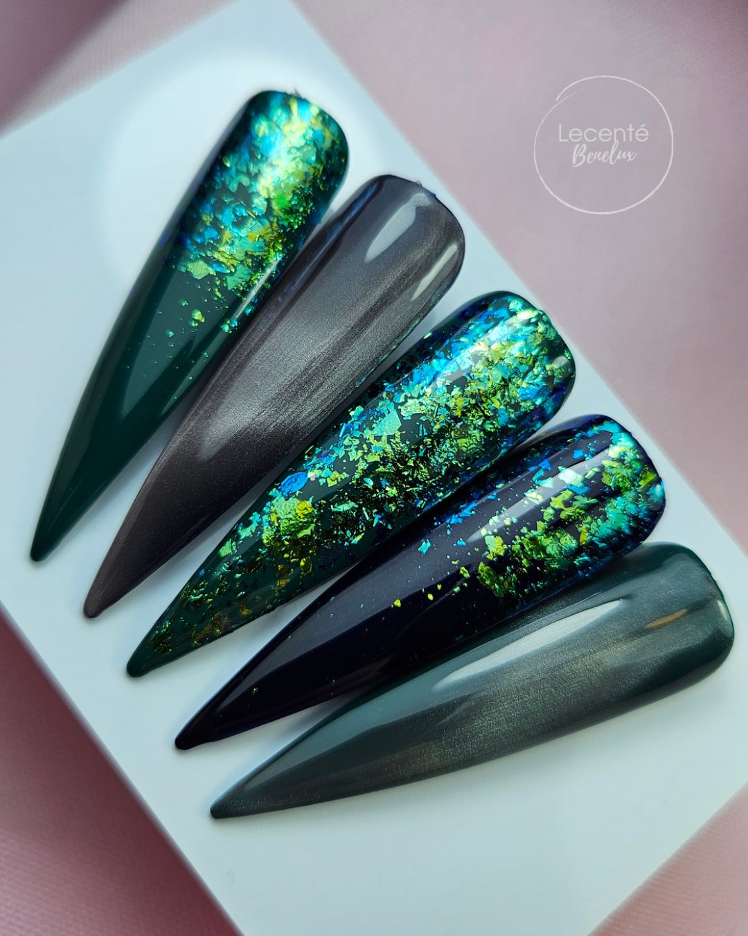 Flakes zijn naar mijn mening de mooiste en veelzijdigste glitters. Ze zijn super dun van structuur en je kunt er ontzettend gave nailart mee creëren. Je kunt inpoetsen op de nagel als een chrome effect en veranderen van kleur op iedere lichte en donkere ondergrond. Nail Flakes zijn niet goedkoop, maar als je kijkt wat je voor terug krijgt met deze prachtige Lecenté Flakes, dan begrijp je helemaal wat ik bedoel. De structuur van de glitter flakes blijft zichtbaar, terwijl het oppervlak glad aanvoelt. In kwaliteit ga je zien dat Lecenté het echt waard is!