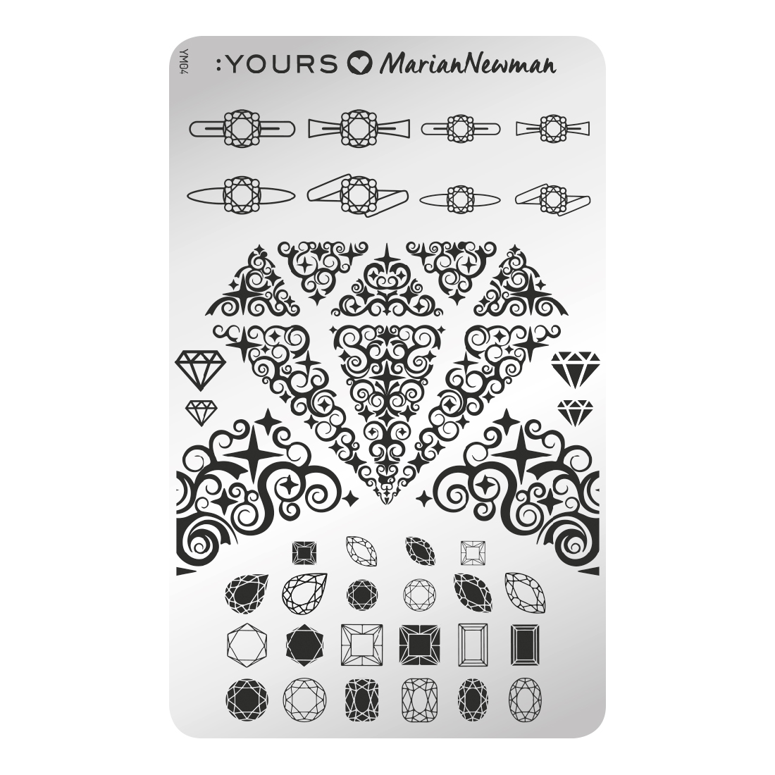 Met de YOURS Loves Marian Newman YLM04 Diamonds are forever stempelplaat wijst Marian er nogmaals op dat ze dol is op kristallen en diamanten. Deze stempelplaat geeft je een verscheidenheid aan opties om mee te werken. Pimp je nagels door stenen op de ringbanden te leggen. Of gebruik enkele van de gelaagde ontwerpen.