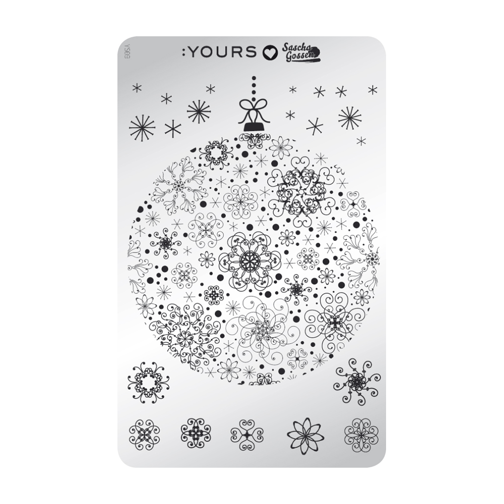 De stempelplaat YOURS Loves Sascha YLS09 Merry Stamping is de kerststempelplaat in deze collectie. Niet met traditionele herten en kerstbomen, maar met een mooie grote kerstbal met een zeer gedetailleerd, winterachtig patroon. Samen met de sneeuwvlokken en de losse figuren maak je de perfecte nagels voor het kerstdiner!